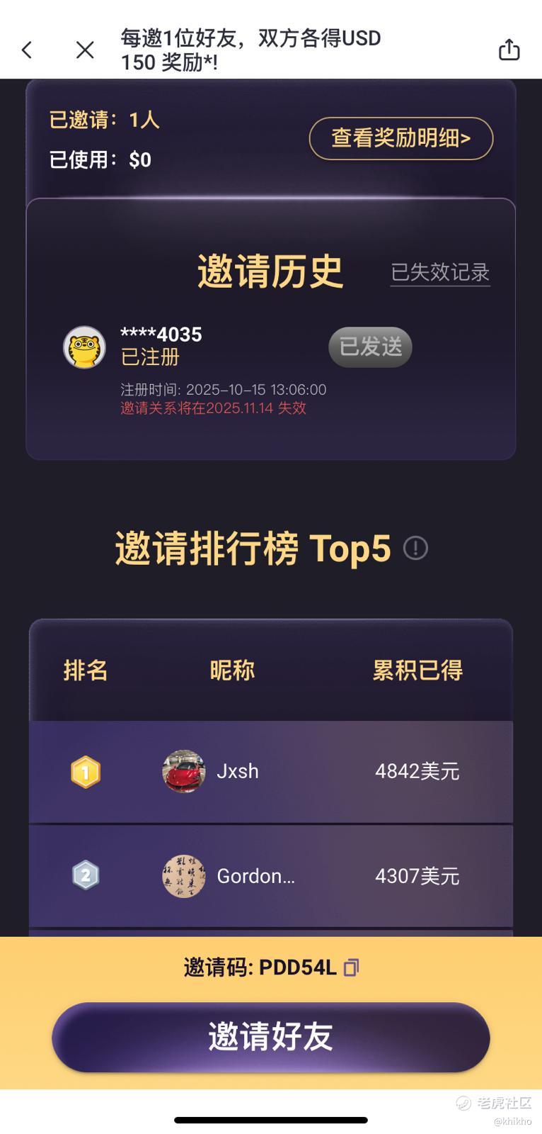 刚介绍了一个朋友加入老虎,哈哈,看广告说的,我们每人都可以得到150美刀的邀请奖励,美的很 [得意]。非常期待,如果真的收到了这笔奖励,那必须要好好的跟朋友们宣一下,让朋友们都去介绍他们的老婆,老公,父母兄弟什么的,玩不玩股票不重要,先拿到这个赠送的150刀再说。[鬼脸]