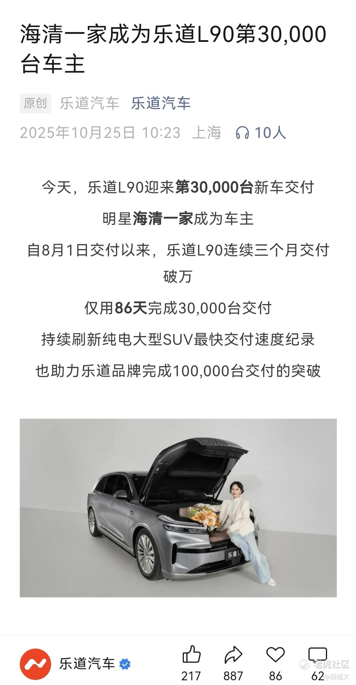 乐道L90上市86天,交付30000台。