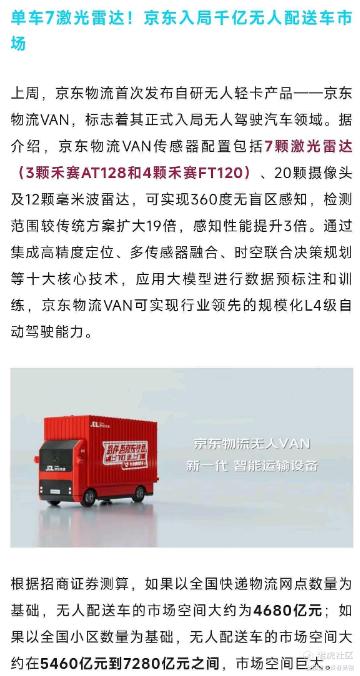 此前,京东物流已经发布自研无人轻卡产品——京东物流VAN,标志着其正式入局无人驾驶汽车领域。据介绍,京东物流VAN传感器配置包括7颗激光雷达(3颗禾赛AT128和4颗禾赛FT120)、20颗摄像头及12颗毫米波雷达,可实现360度无盲区感知,检测范围较传统方案扩大19倍,感知性能提升3倍。通过集成高精度定位、多传感器融合、时空联合决策规划等十大核心技术,应用大模型进行数据预标注和训练,京东物流VAN可实现行业领先的规模化L4级自动驾驶能力。