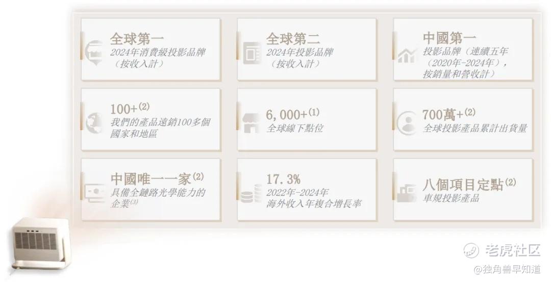 据招股书,极米科技致力于各种消费级、车规级、工程级智能投影产品的研发、生产与销售。截至最后实际可行日期,极米科技的业务覆盖欧洲、北美、日本、澳大利亚等100多个国家和地区,全球线下点位数量超6,000家,全球投影设备累计出货量超700万台。