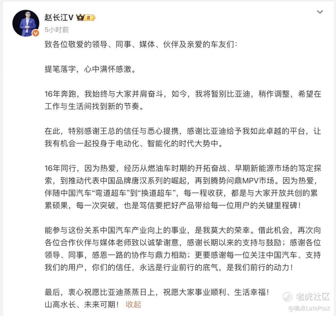 有近 112 万微博粉丝的比亚迪腾势品牌前总经理赵长江,是比亚迪高管里粉丝第二多的,但直播给用户唱歌哽咽什么的,只有他干过。10 月 24 日,赵长江在微博和微信朋友圈官宣了自己将离开比亚迪的消息。