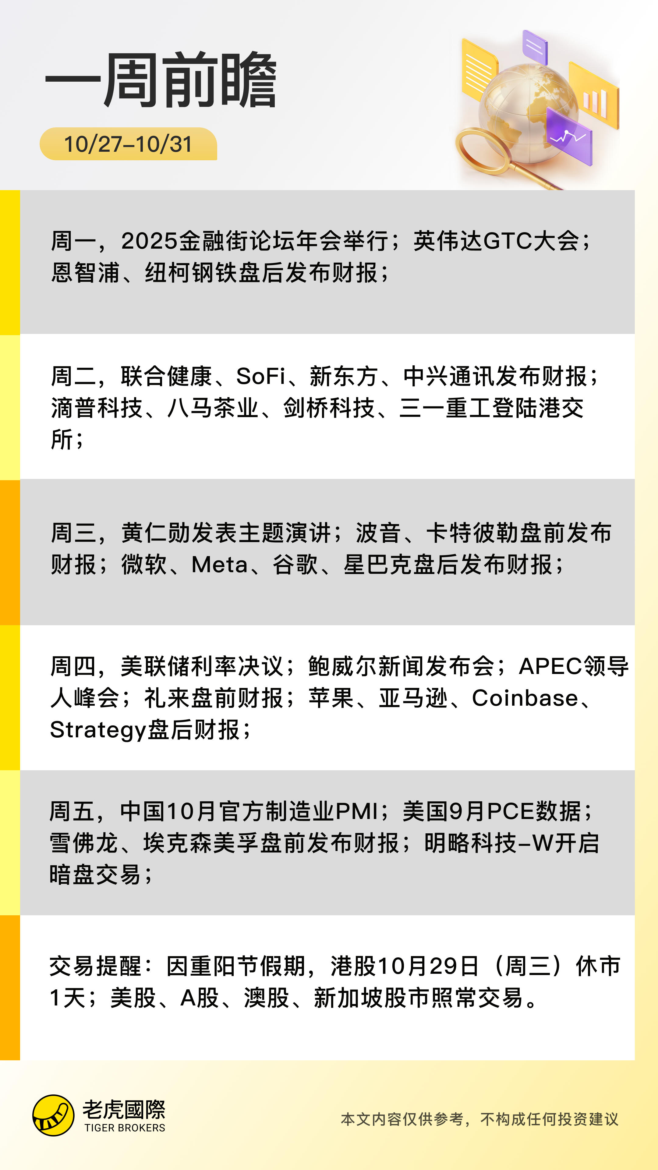 财经事件:鲍威尔、植田和男、拉加德将召开货币政策新闻发布会;2025金融街论坛年会举行;APEC领导人峰会;中美在马来西亚举行经贸磋商;华盛顿特区英伟达GTC大会,黄仁勋发表演讲;