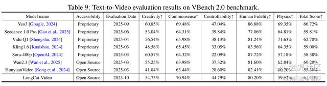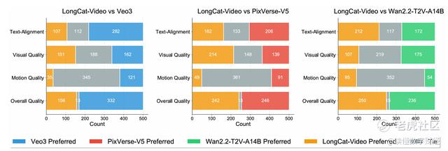 技术报告还称,LongCat-Video的模型评估围绕内部基准测试和公开基准测试展开,覆盖 Text-to-Video(文本生成视频)、Image-to-Video(图像生成视频)两大核心任务,从多维度(文本对齐、图像对齐、视觉质量、运动质量、整体质量)验证模型性能:136亿参数的视频生成基座模型,在文生视频、图生视频两大核心任务中,综合性能均达到当前开源领域SOTA级别;通过文本 - 视频对齐、视觉质量、运动质量、整体质量四大维度评估,其性能在文本对齐度、运动连贯性等关键指标上展现显著优势;在VBench等公开基准测试中,LongCat-Video在参评模型中整体表现优异。