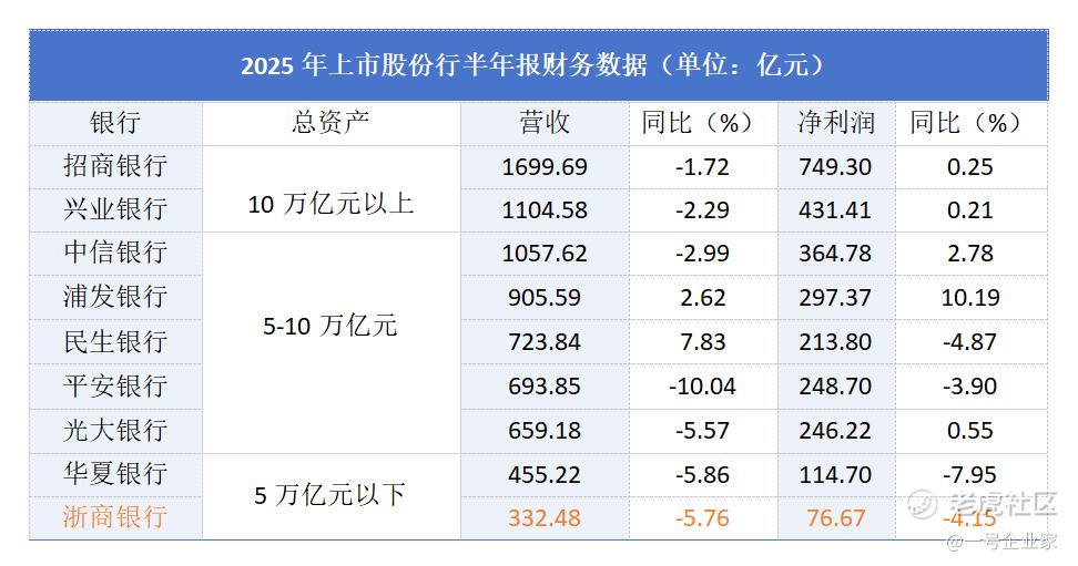 截至2025年6月末,浙商银行总资产3.3万亿元、营业收入332.48亿元、净利润76.67亿元,三大指标排名均排在最后一位。
