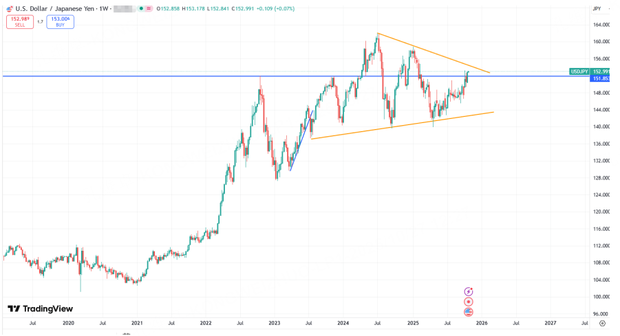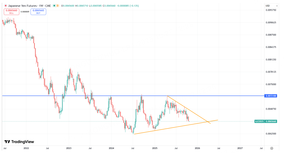 日元自2024年末以来都在底部徘徊和拉锯中,尚未真正取得突破。众所周知,日元是套利货币,其上涨代表市场偏好恶化,其下跌则意味着市场结构良好。我们也可以用美元/日元来对比参考,也是大区间收敛的形态。