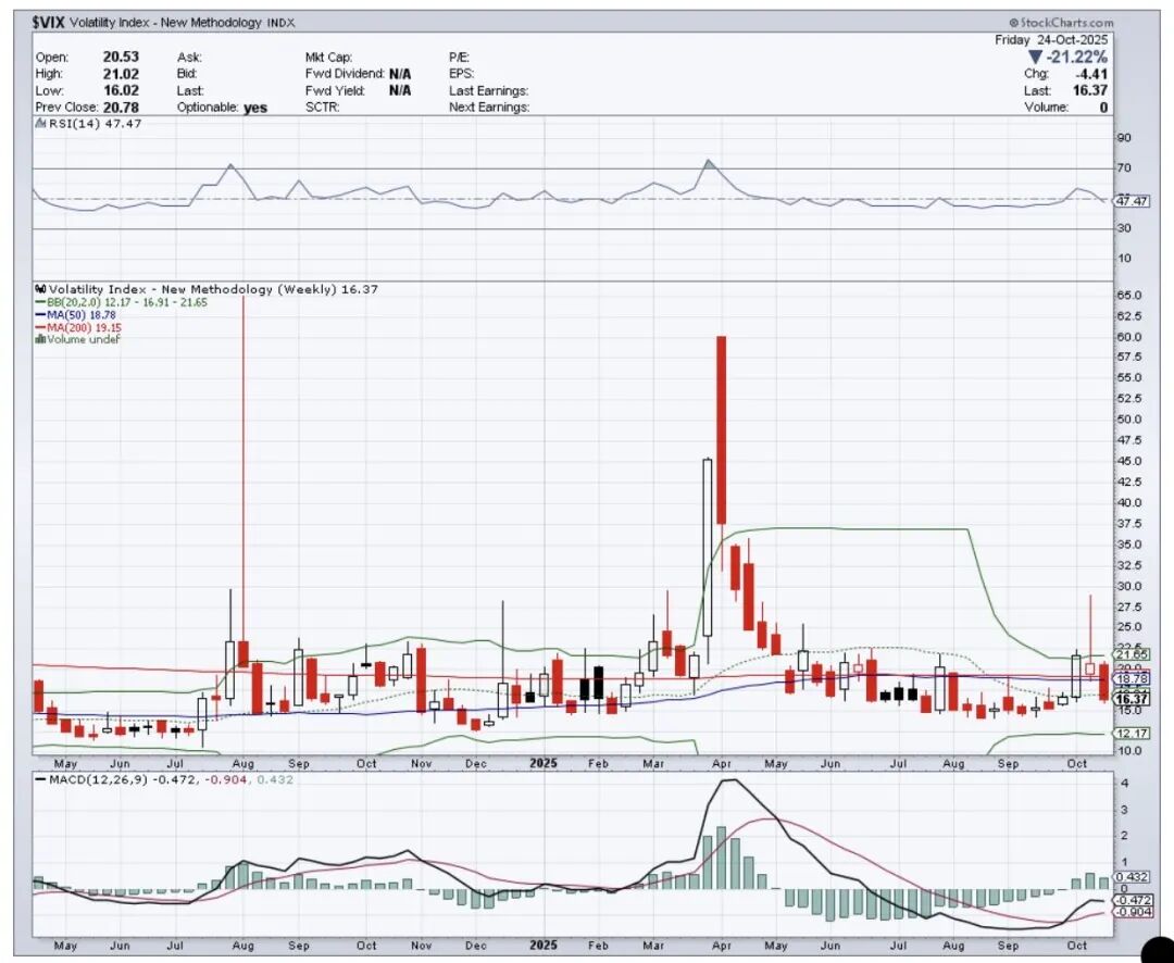 VIX周线收长阴跌,跌下布林中线。 这次VIX的爆发夭折, 早有预感。 原因是没有触布林下线。 下面要为此补课。