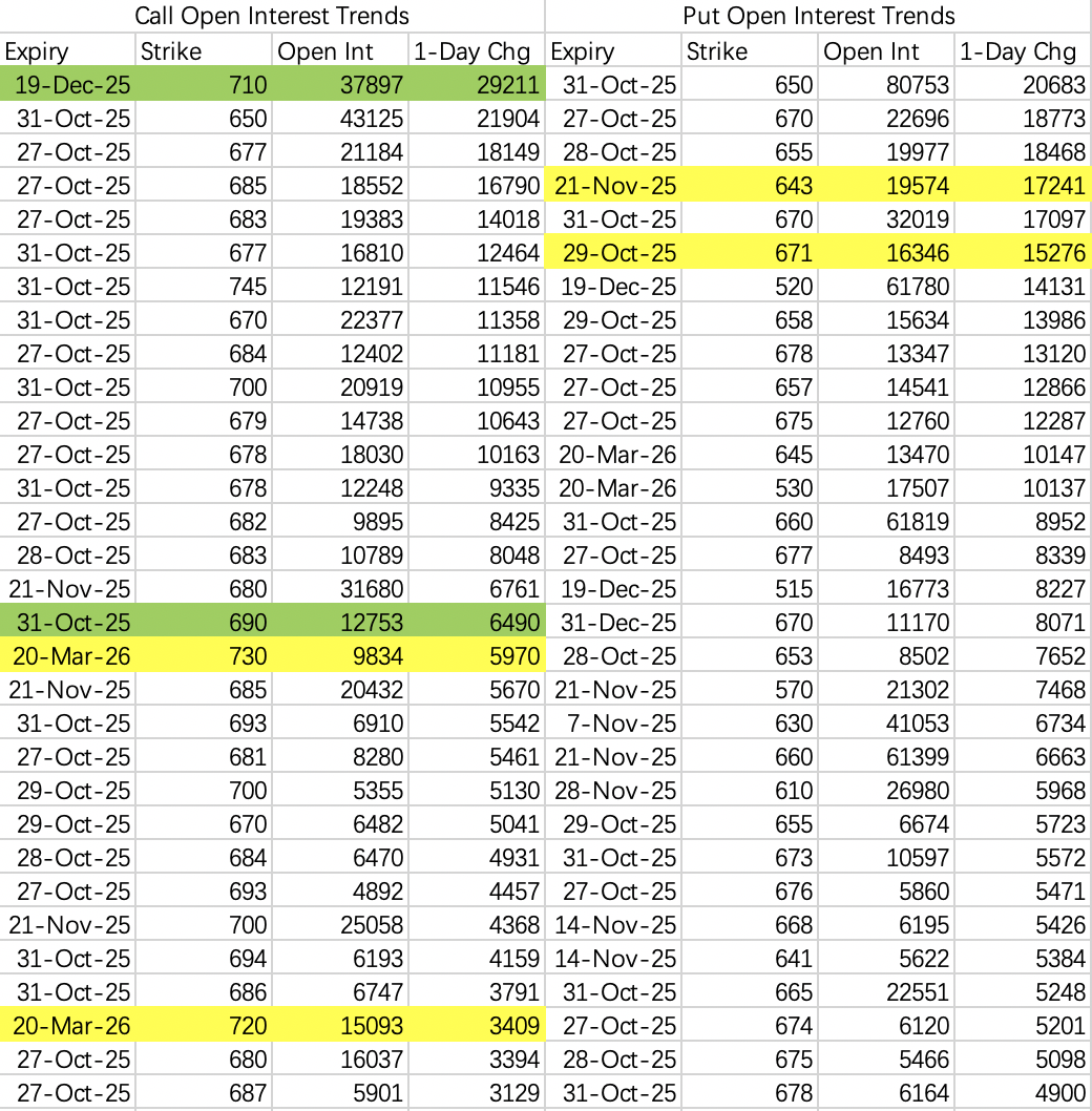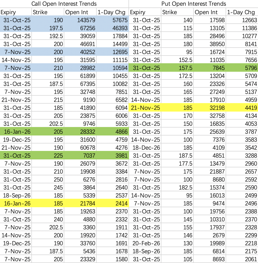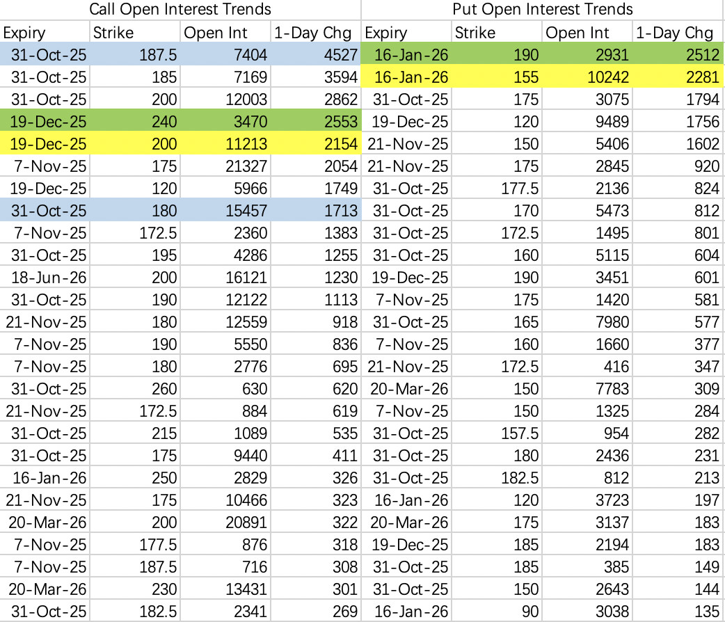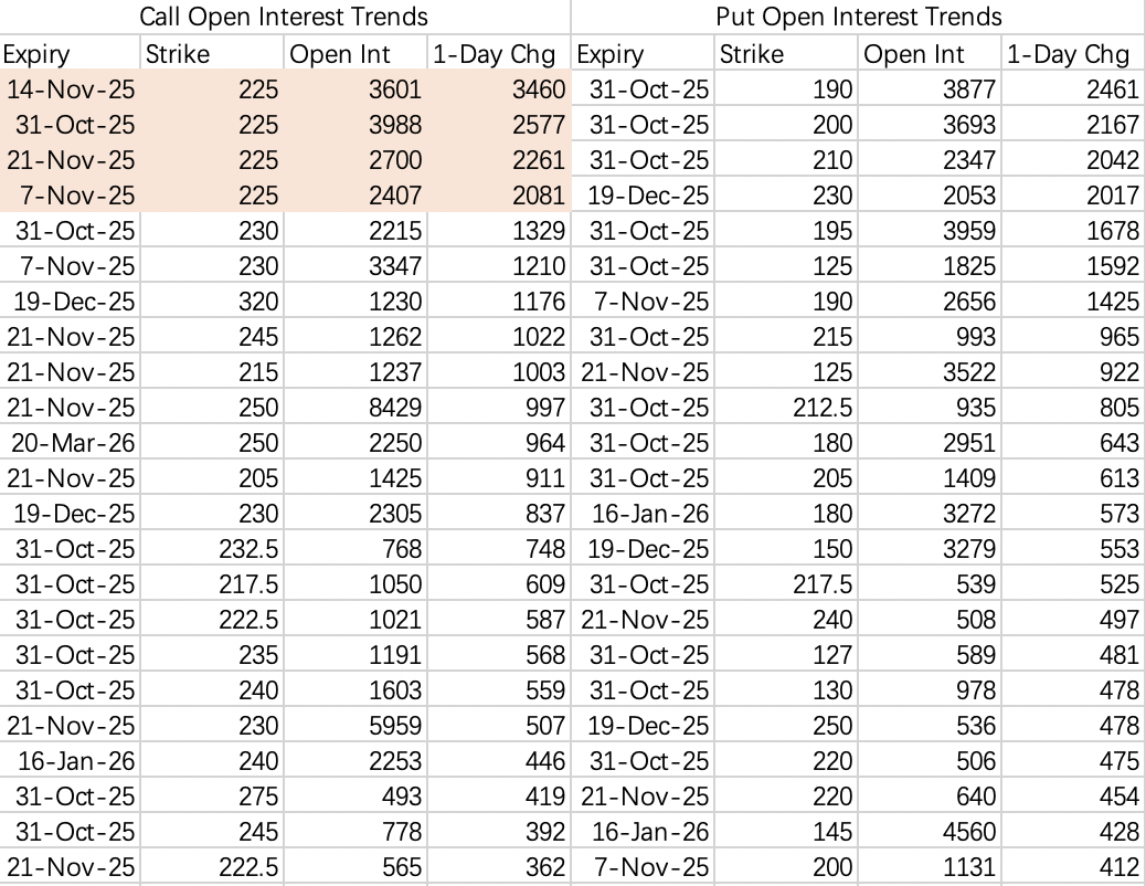 存储芯片价格一直在涨,对股价构成驱动力。不过期权集中开仓225构成了一定阻力 $MU 20251031 225.0 CALL$ ,sell put可以选200 $MU 20251031 200.0 PUT$