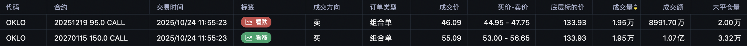大单平仓 $OKLO 20251219 95.0 CALL$ ,roll开仓远期150call $OKLO 20270115 150.0 CALL$