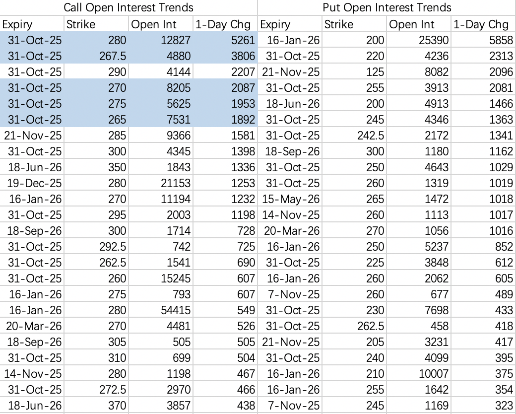 本周财报,本季度因为有罚款所以每股收益预期不行。机构sell call价差策略的行权价预期财报涨幅比较低,卖出265 $GOOGL 20251031 265.0 CALL$ 和267.5call $GOOGL 20251031 267.5 CALL$ ,买入275和280call $GOOGL 20251031 280.0 CALL$ 对冲。
