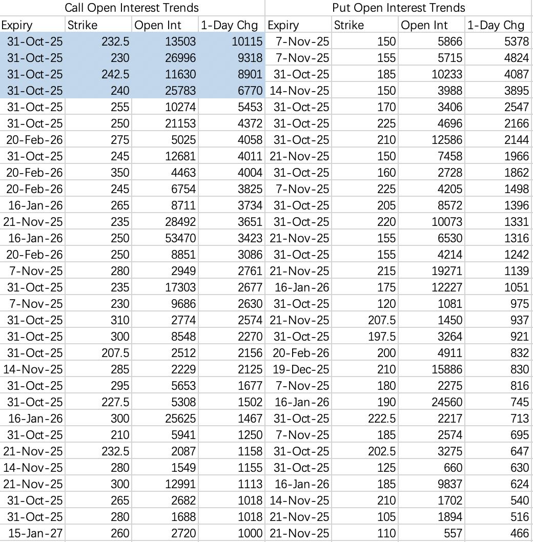 本周财报,市场没有给太高预期,机构的价差策略卖出230和232.5call $AMZN 20251031 230.0 CALL$ ,对冲240和242.5call $AMZN 20251031 240.0 CALL$ .