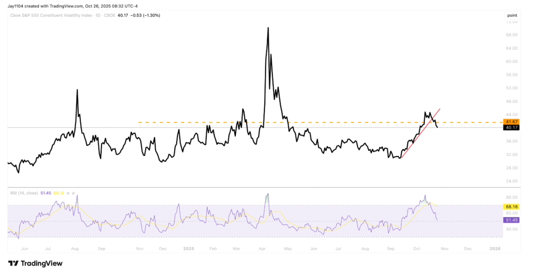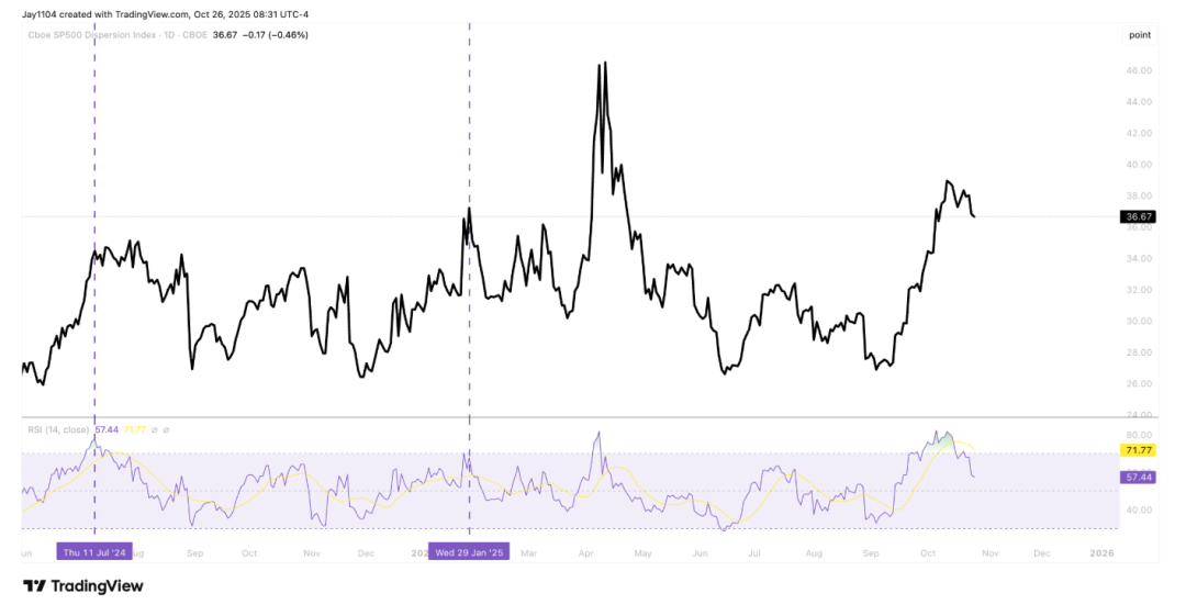 此外,本周由于正值财报季,我们应该会看到自9月中旬以来大部分波动率分散交易的结束。在近几个交易日,随着公司公布业绩,我们已经开始看到这个过程展开。标普500指数分散指数已经转跌,随着更多公司业绩公布,该指数本周应会继续下滑。