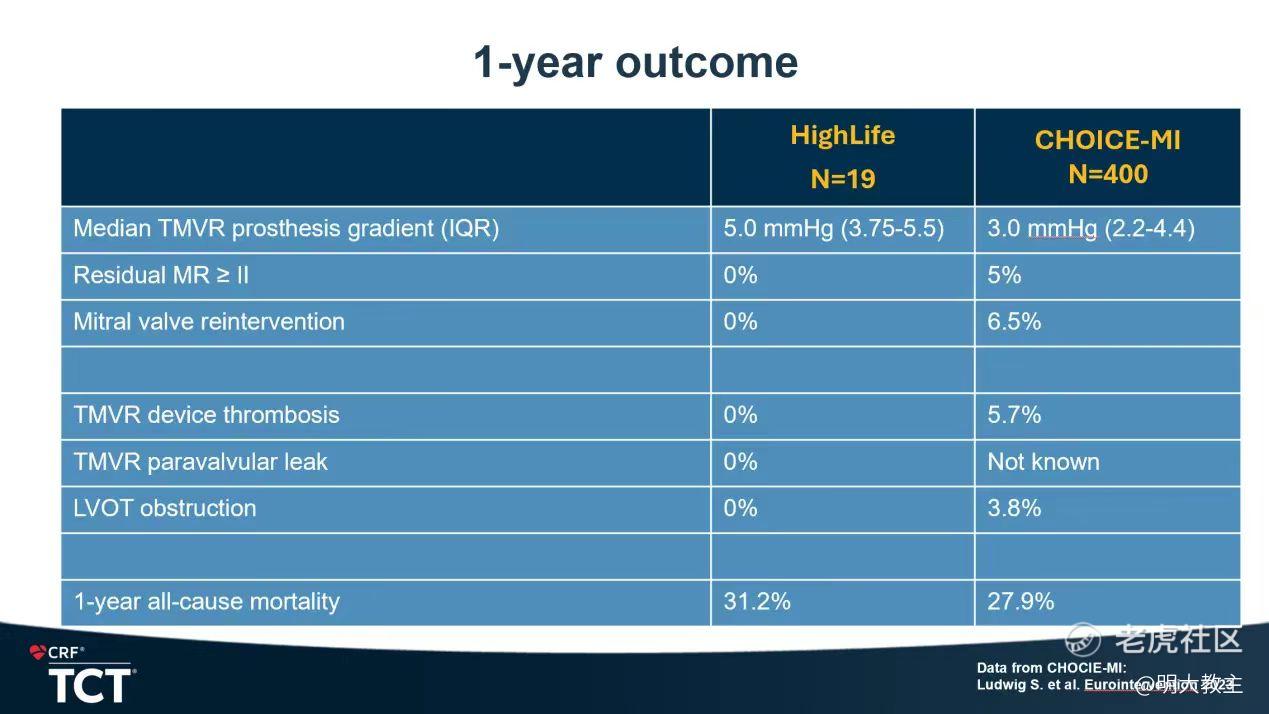在本次大会上还披露了使用HighLife治疗患者与CHOICE-MI试验(一项全球多中心回顾性研究,评估TEER、TMVI在重度二尖瓣反流患者中的作用的研究)的数据对照,HighLife的有效性、安全性再度得以验证。