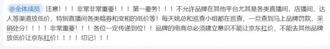 为此京东还组建了巡查小组,专人专岗,一查到底。爆料说京东还给商家发了针对其他平台的运营要求,明确不让搞直播抽奖、不让发优惠券,连价格优势都不许提。一旦违规,商家将面临货款冻结,甚至巨额罚款。一个商品罚款竟高达500万。