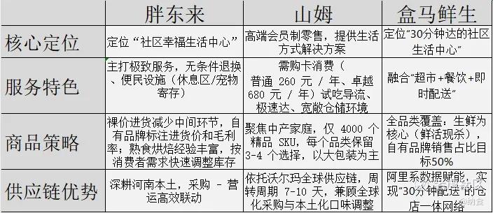 胖东来、山姆、盒马鲜生的商业模式差异显著,从定位到运营各有侧重,形成鲜明对比。