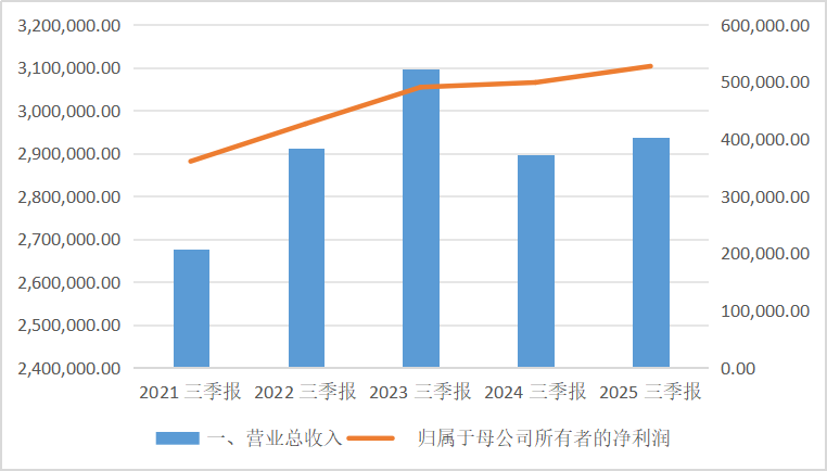 2025年前三季度实现营业收入293.67亿元,同比增长1.41%;归母净利润52.74亿元,同比增长5.70%。其中第三季度单季实现营收88.76亿元,同比下降0.17%;归母净利润13.7亿元,同比增长1.62% 13 。净利润增速显著高于营收增速。