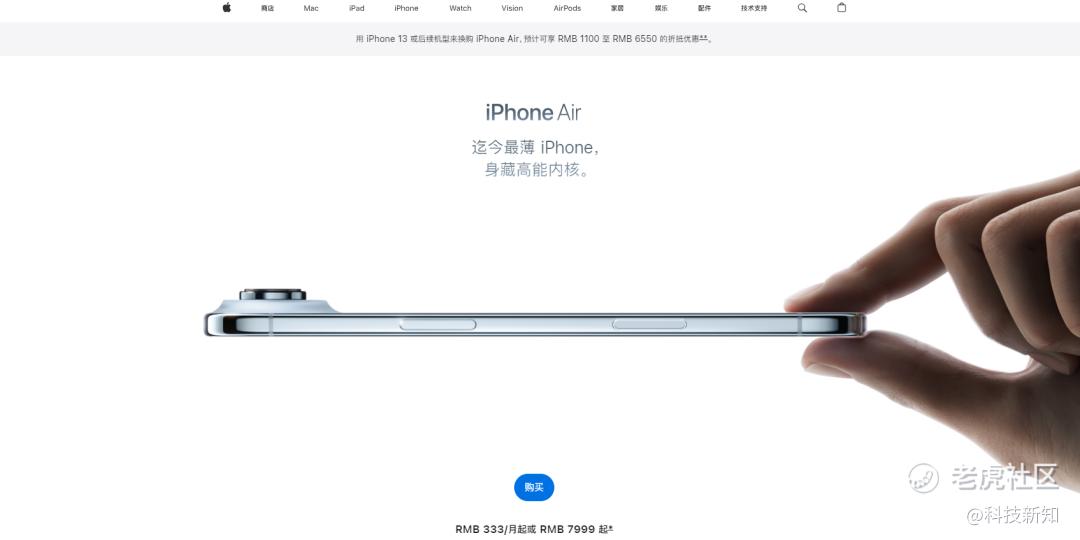 其新发布的iPhone Air,整机重量仅为165克,厚度低至5.6毫米,是苹果迄今为止最轻薄的智能手机。