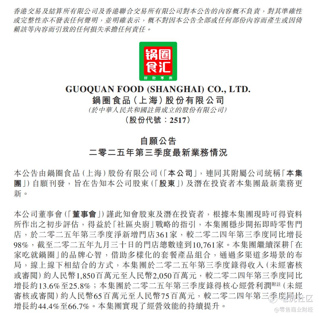 10月28日,锅圈发布第三季度财报。从财报数据来看,锅圈门店总数达10,761家,季度净增361家,这一增幅较2024年同期同比增长98%;预计实现收入约18.50亿元至20.50亿元,同比增长13.6%至25.8%;核心经营利润约人民币6,500万元至7,500万元,同比增长44.4%至66.7%。