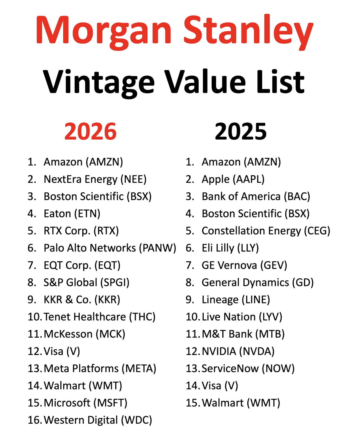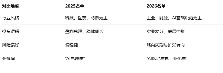 对比25年选股,可以看出26年大摩选股,重点已经从应用层龙头流向了基础设施与能源板块,更看好能源、医疗、工业是AI后周期的真正赢家,新增如 $伊顿(ETN)$ , $Nextera Energy Inc(NEE-N)$ $Palo Alto Networks(PANW)$ 等个股。