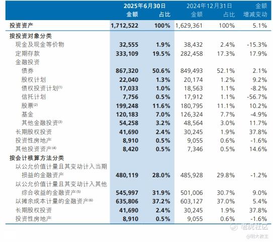 中国平安上半年债权类资产比例超70%。或出于减少资本消耗的目的,平安减少了债权基金、理财产品投资,增加了交易型债券的配比,债权投资整体金额与去年末相仿。