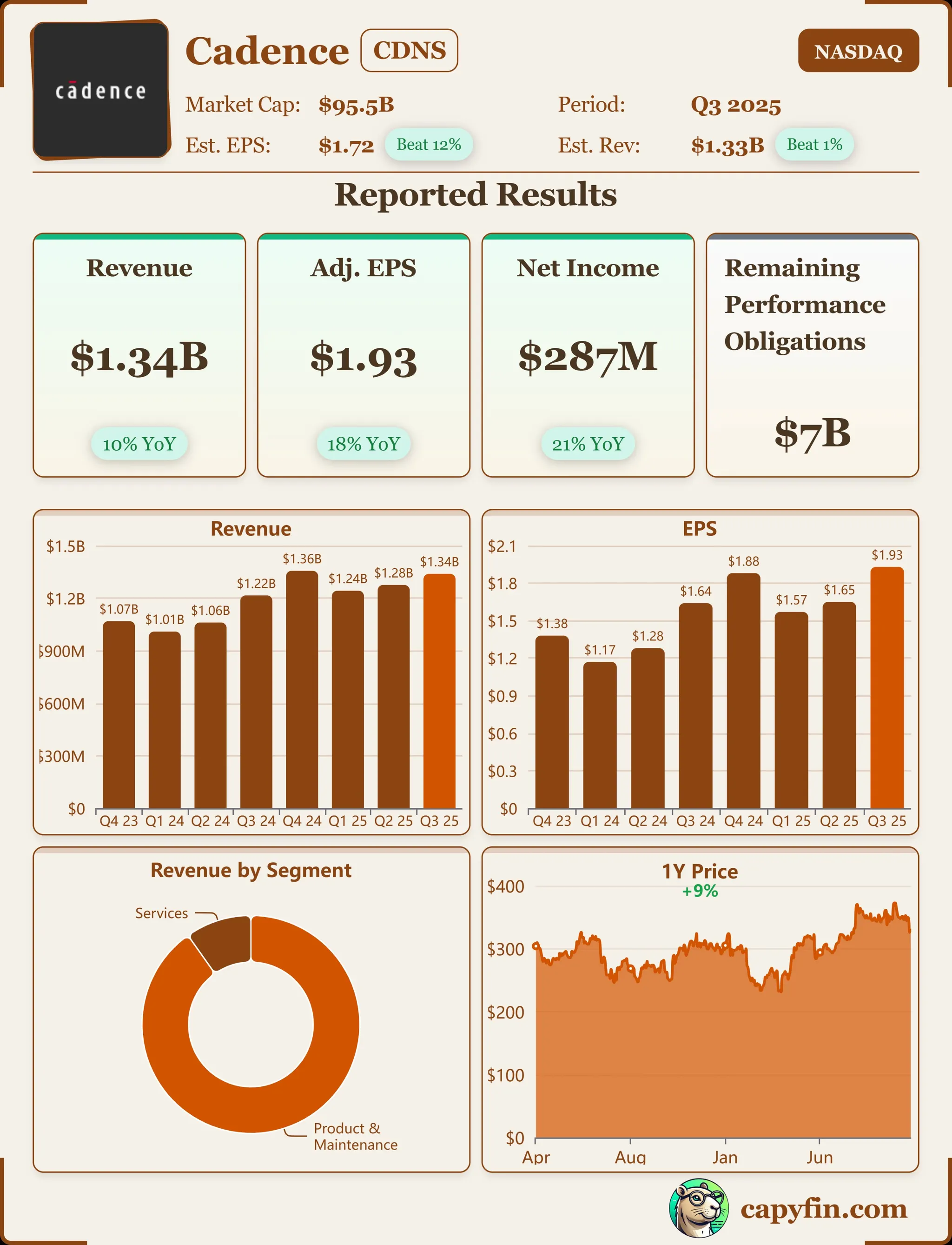 营收增长强劲:Q3营收达到13.39亿美元,同比增加10.2%,环比增长约5%,超出分析师预期的13.2亿美元。驱动因素主要来自AI兆趋势下的设计活动爆发,特别是核心EDA工具和IP业务的贡献,占总营收比重持续提升。该指标超预期,显示公司受益于半导体行业复苏,但与上季度相比增速略有放缓,暗示业务结构中硬件交付的季节性影响开始显现。