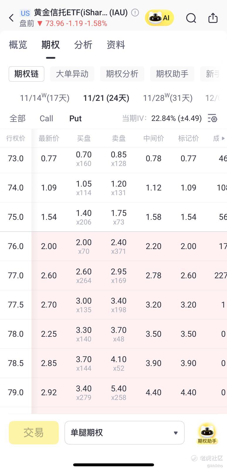 目前 $黄金信托ETF(iShares)(IAU)$ 73块多虽然不算很低的位置,但是我打算今晚卖一张Put,行权价就放在74. 行权日放11月21日,我个人觉得接到股票的概率不太大,很可能就是吃一点权利金而已。万一买到了股票,那就当存了一点金子吧,反正都是想买的,哈哈 [财迷]
