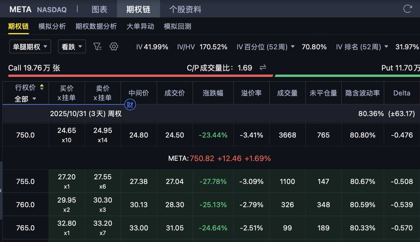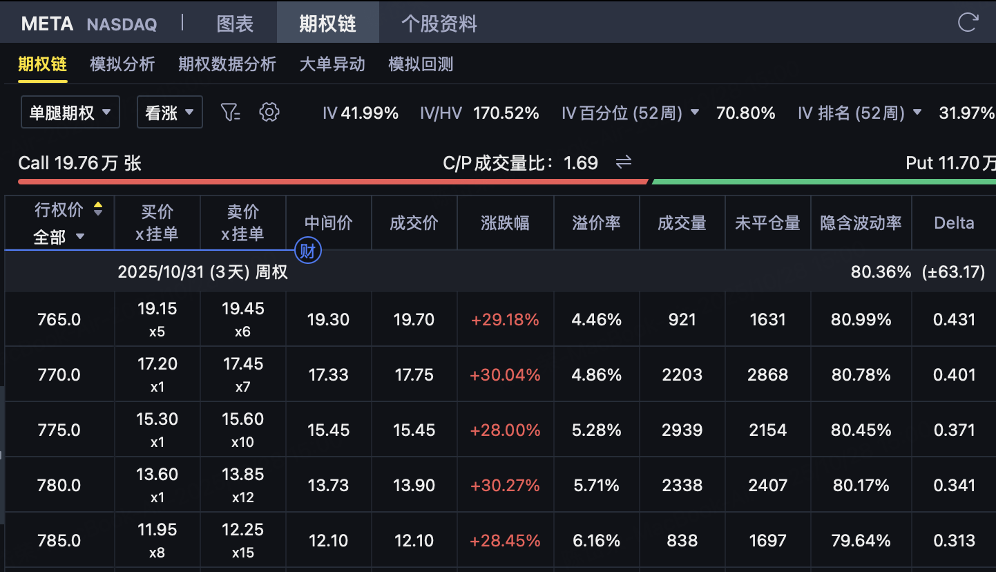 盈利条件: 当 META 股价在到期时介于 $750 与 $765 之间时,所有期权到期作废,投资者保留全部权利金 $31.28。