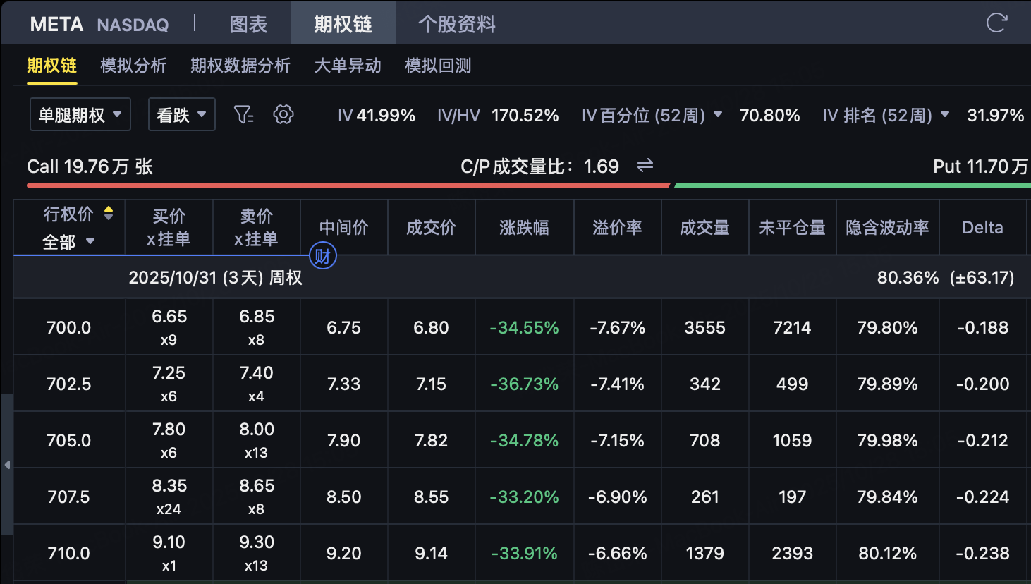 买入 $700 Put(支出权利金 $6.8)