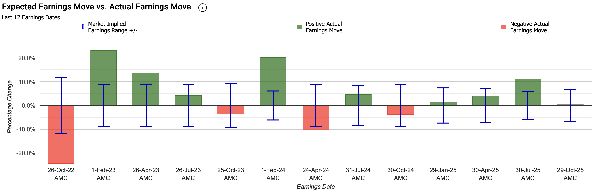 过去六次财报季,Meta的实际股价波动为:-10.6%,+4.8%,-4.1%,+1.6%,+4.2%,+11.3%