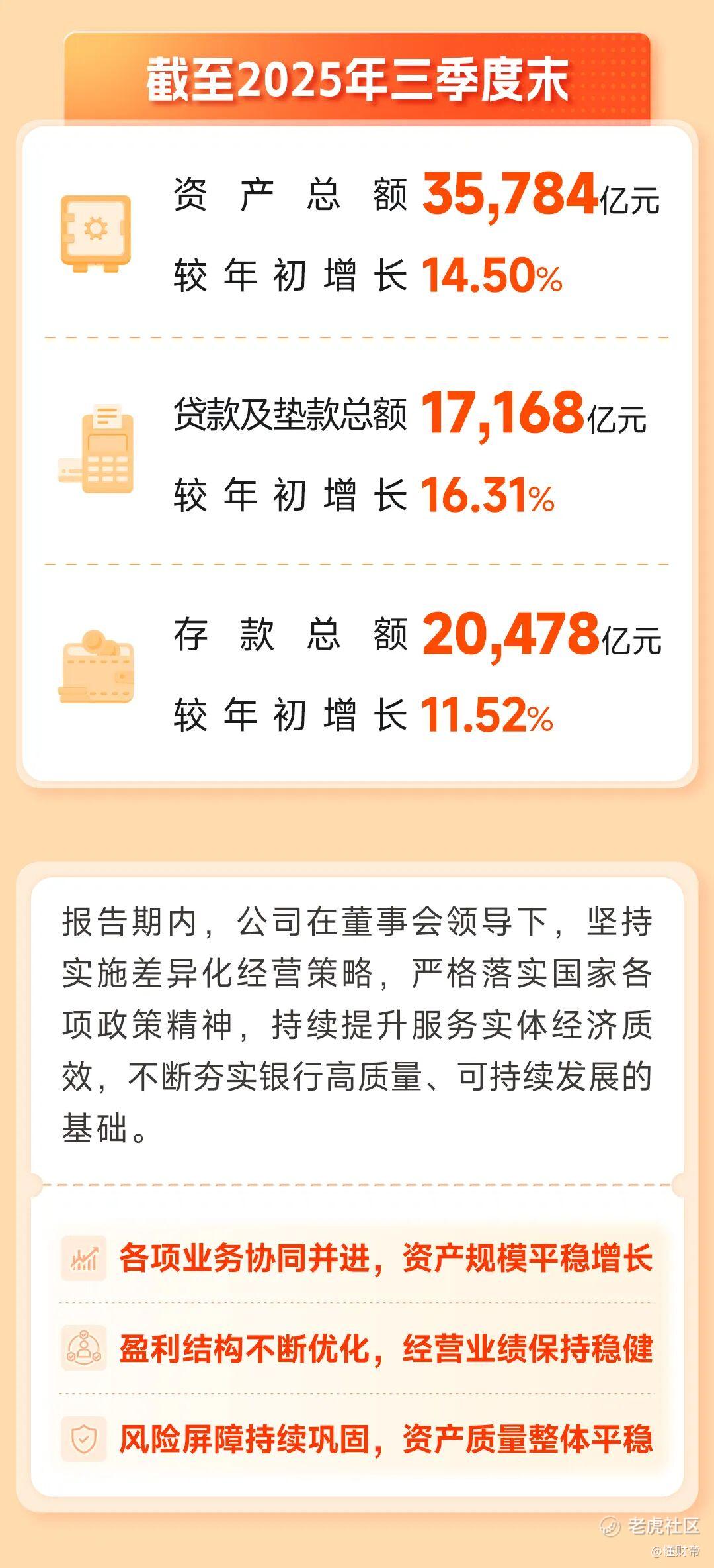 2025年前三季度,宁波银行紧紧围绕“专注主业,服务实体”的经营思路,持续加大实体经济支持力度,提升服务的广度和深度,推动资产规模持续增长。