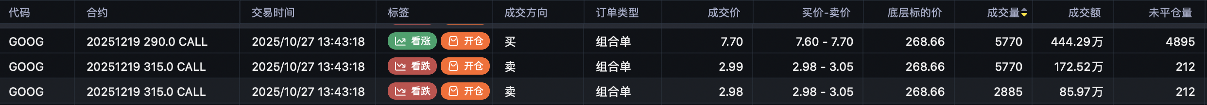 远期看涨价差买入290call卖出315call: $GOOGL 20251219 290.0 CALL$ $GOOGL 20251219 315.0 CALL$