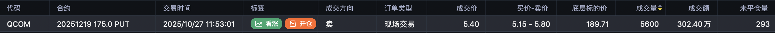 上周五有大单提前埋伏了高通上涨,买入了价外看涨11月7日到期180call $QCOM 20251107 180.0 CALL$ ,开仓7633手,成交价约在2.85。