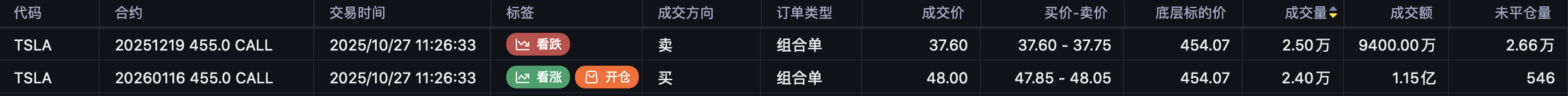 不过long call大单在这个节点上roll 仓了,同样行权价roll到一个月之后:平仓 $TSLA 20251219 455.0 CALL$ ,roll到 $TSLA 20260116 455.0 CALL$ ,不是很理解这个操作意味着什么。