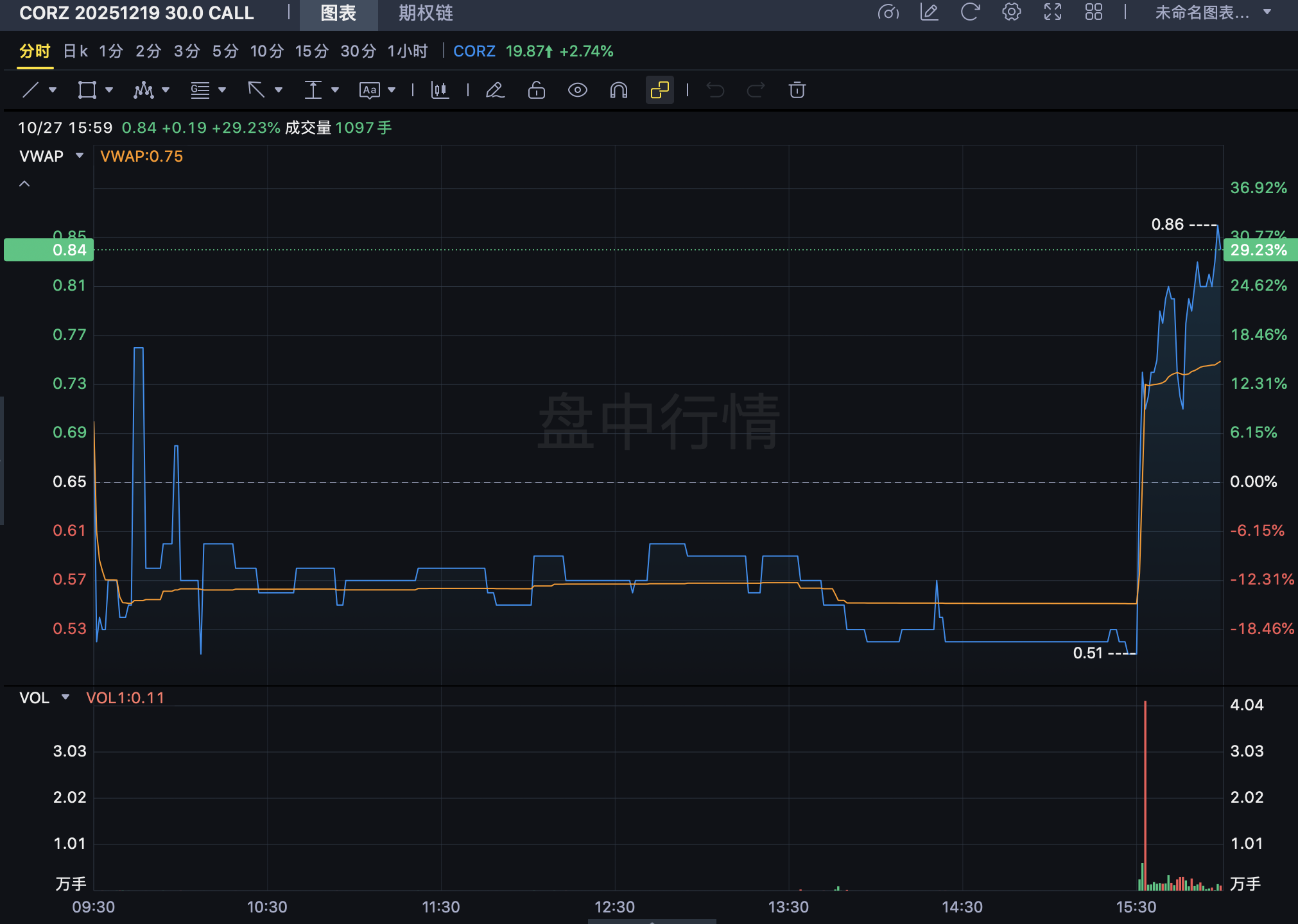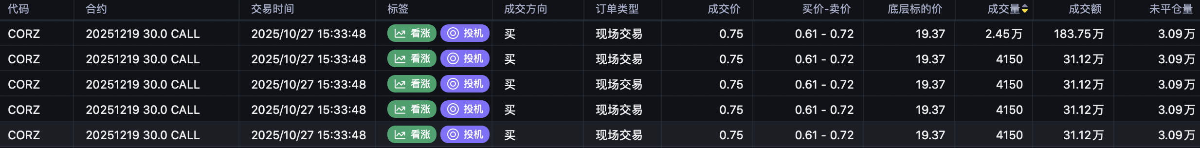 今天最疯狂的看涨,大单买入12月到期30call $CORZ 20251219 30.0 CALL$ 开仓7.2万手,成交量9.25万手,总成家额约700万。