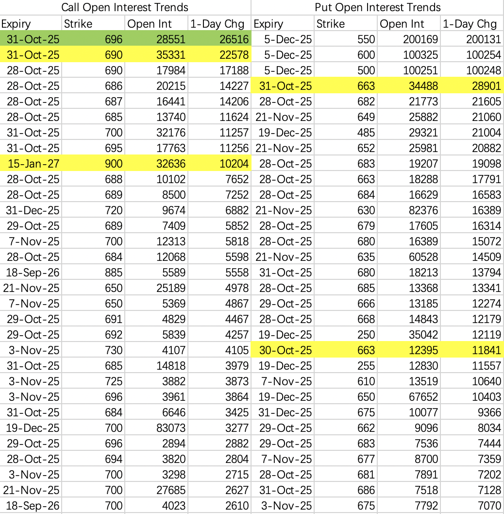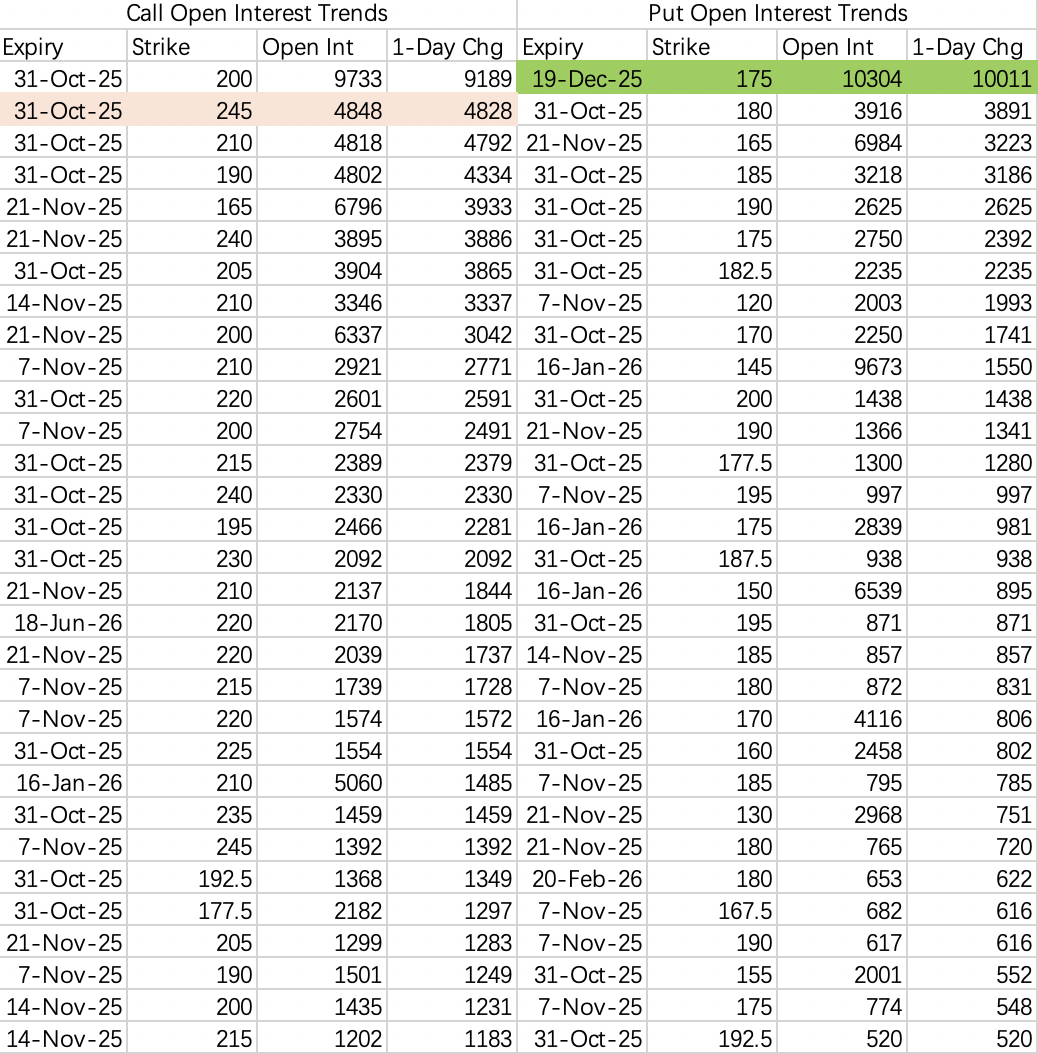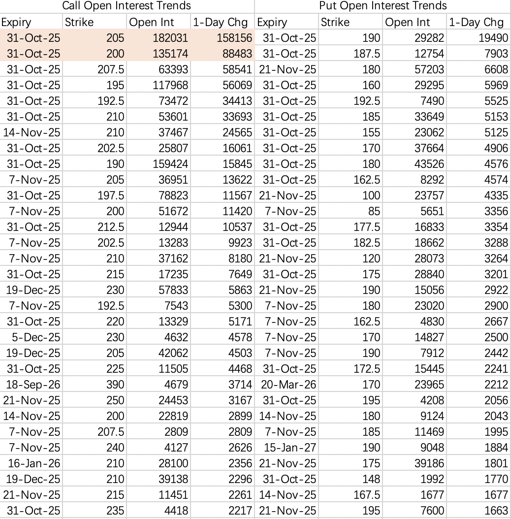 突破200再度提上日程,虽然本周不会发生,吧?很不好说,感觉多头已经跃跃欲试了,200和205call开仓量位居榜首 $NVDA 20251031 200.0 CALL$ $NVDA 20251031 205.0 CALL$ 。