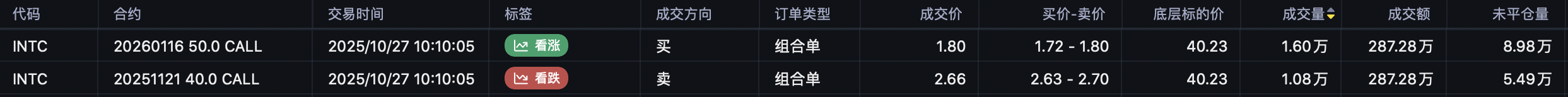 long call大单40roll到50:平仓 $INTC 20251121 40.0 CALL$,roll开仓 $INTC 20260116 50.0 CALL$