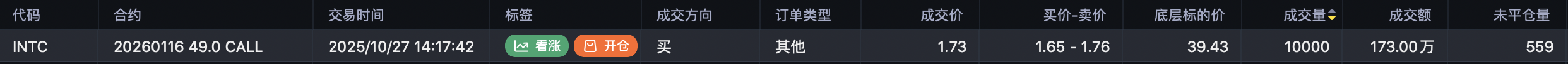 比如26年1月到期49call $INTC 20260116 49.0 CALL$ 成交量1万手,成交额173万。
