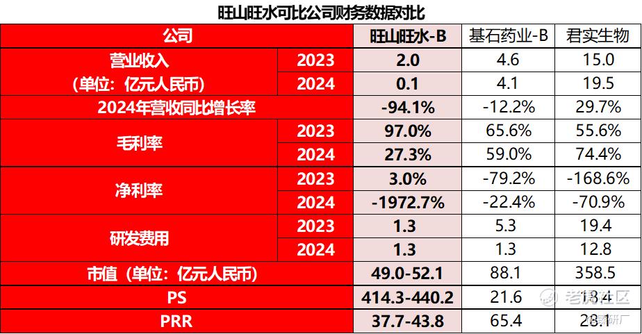 由于核心产品尚处于研发或商业化初期阶段,旺山旺水的营收规模、利润水平与可比公司都有较大差距,对比PS则显著高估,对比市研率PRR,公司发行定价位于合理区间。