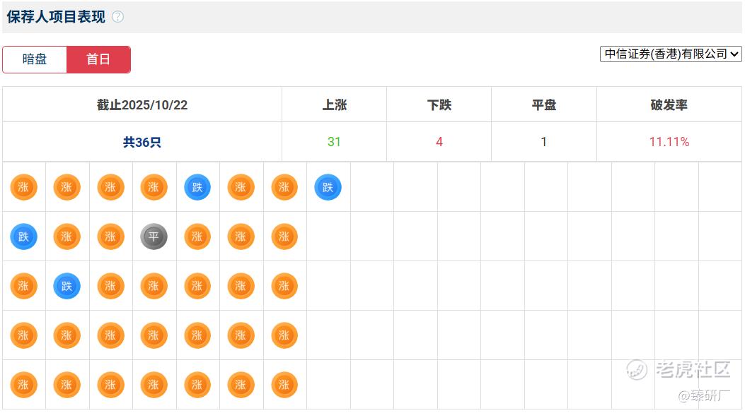 中信历史上作为保荐人参与了36个项目,暗盘及首日有31家公司上涨,4家公司下跌,1家公司平盘,破发率11.11%,破发率极低。