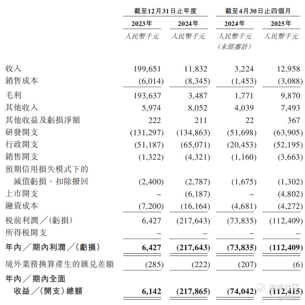 2023年至2025年前四个月,旺山旺水的收入来自于核心产品VV116(在中国和乌兹别克斯坦获批准用于治疗COVID-19)相关的里程碑以及权利转让和特许权使用费付款、向若干中国医药公司提供CRO服务、销售药品、转让知识产权,分别为2.0亿元、1,183.2万元和1,295.8万元。报告期内,公司毛利率分别为97.0%、27.3%、75.0%,净利润分别为642.7万元、-2.2亿、-1.1亿元。