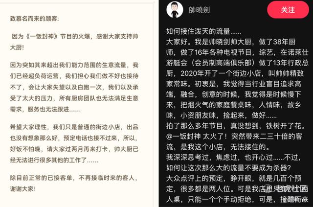 帅晓剑帅大厨在小红书发布长文表示「突然带来了二三十倍的客流」,而据小红书用户晒图,红棉餐厅的预约也已经排到了11月之后。除此之外,每天都还有用户在复刻大厨们的同款菜肴。