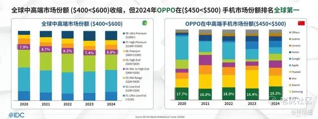而IDC数据也显示,2024年OPPO在全球中高端市场(450-500美元)份额排名第一,且OPPO在2025年第二季度的平均销售价格同比增长14%,在排名前五的品牌中增速最快。截至2025年第二季度,OPPO全球中高端手机(售价400美元以上)出货量同比增长46.6%。