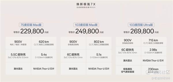 全新极氪7X正式上市,全系都升级到了900V高压架构,而且标配英伟达Thor-U芯片和激光雷达,可以说是诚意满满。这次一共推出了3款配置:75度后驱Max版搭载370kW电机,续航620km;103度后驱Max版续航提升至802km;而103度四驱Ultra版则拥有585kW双电机,续航715km,并配备空气悬架。
