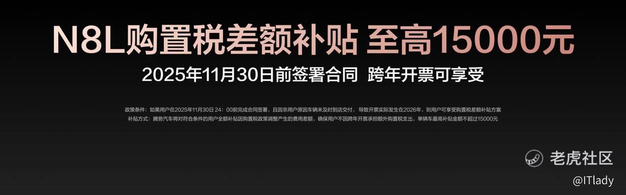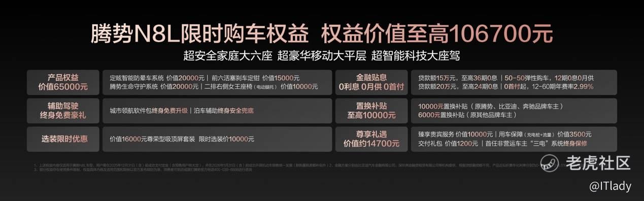 为回馈广大用户的支持与信赖,腾势N8L特别推出限时购车权益,权益价值至高10.67万元!包括价值1.7万元的三年免息,最高1万元的置换补贴。