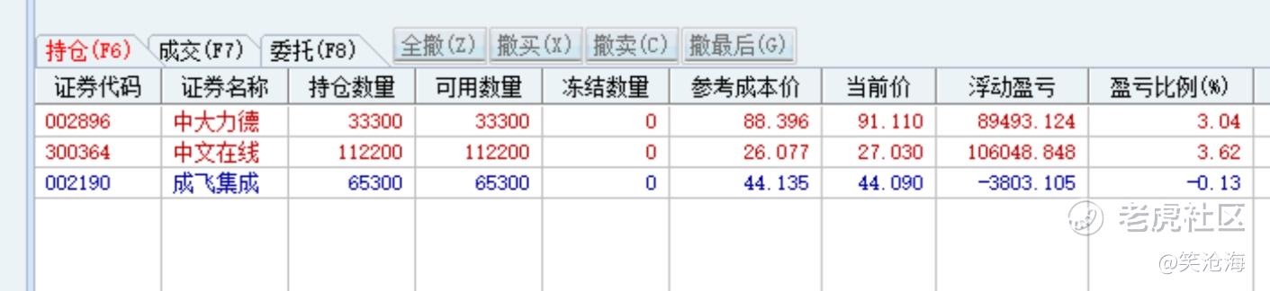 最近趋势和情绪是跷跷板,趋势回落,情绪就会上来,反之亦然,这也是大家觉得最近没有赚的原因,头部抱团在虹吸整个市场,每天就机构抱团那点东西在涨,大部分人不赚,怎么可能会放量呢,等题材唱戏的时候就会好转,四千点不靠群众的力量是站不稳的$成飞集成(002190)$ $中文在线(300364)$ $中大力德(002896)$ $合锻智能(603011)$ $浙江世宝(002703)$
