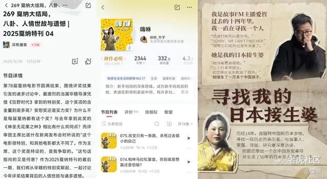 更难得的是,在内容碎片化的当下,播客保持着更高的叙事完整度,能够围绕一个核心话题进行多角度剖析。比如深焦播客的戛纳电影节专题,就把电影节讲透了,从影片点评到行业八卦全方位拆解,让许多资深影迷直呼过瘾;还有故事 FM的 “寻找我的日本接生婆” 系列,用八集节目完整讲述日本接生婆山口秋子(中文名刘岩)的传奇人生,以及她与中国东北一个矿区家庭跨越 70 年的羁绊,让听众如同追剧般投入。这种完整叙事在当下尤为稀缺。