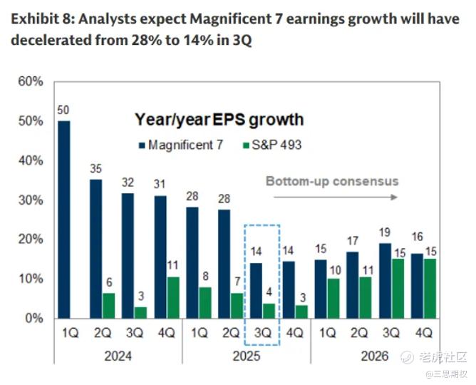 从短期来看,已经开始的美股盈利季将是市场看AI主题的重要窗口之一,特别是在大量的资本支出之后能不能看到盈利的兑现。有意思的是,目前市场只预期美股Mag7盈利增长只有14%, 相比过去季报离平均30%的增长低了不少。