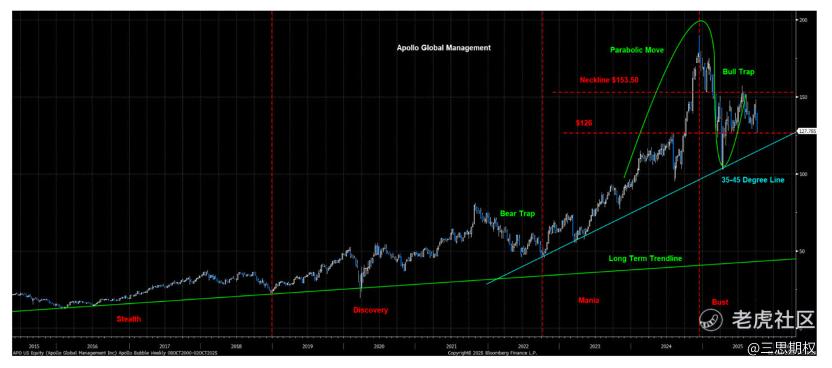 阿波罗(APO)的股价路径,几乎复刻“经典泡沫”的形态:先是“建仓期”里聪明钱布局,随后“发现期”机构资金涌入,再到“狂热期”加速推高,最终在一次诱多反弹(bull trap)后确认顶部。即便短线在 126 美元一带出现技术性企稳,也更像“逢高减仓”的节奏;若继续回归长期均值,市场并不排除它沿长期趋势线深度回撤的可能。