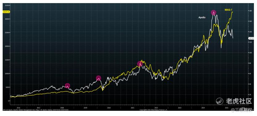 值得注意的是几家私募公司的股价技术走势,也已经在暗示一定的脆弱性,支持着“蟑螂论”。观察阿波罗全球管理(Apollo Global Management,APO),这是一家以私募股权 + 私募信贷 + 基础设施 + 保险资产负债表为核心的全球性另类资产管理公司,资产端覆盖杠杆收购、结构性信贷、航空/电力/数据中心等硬核资产。