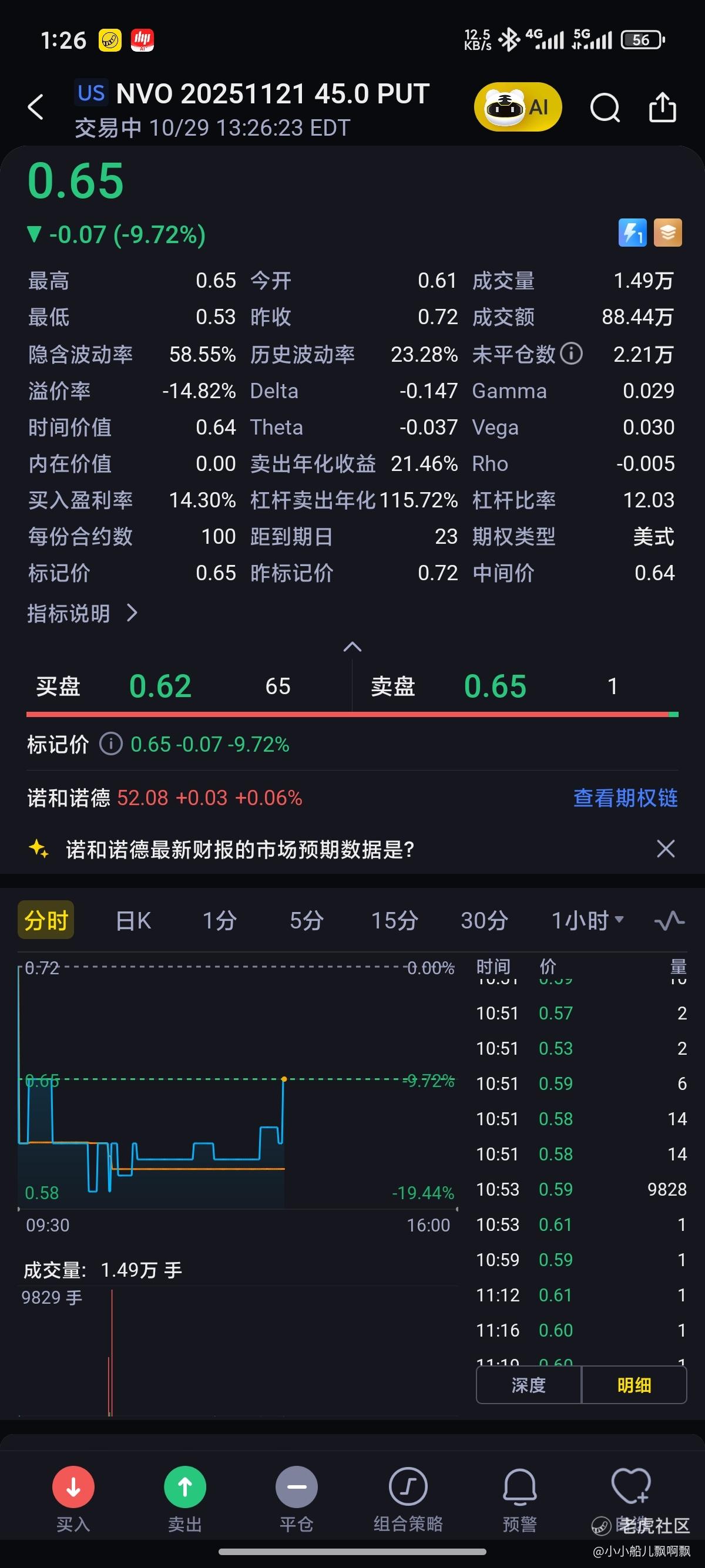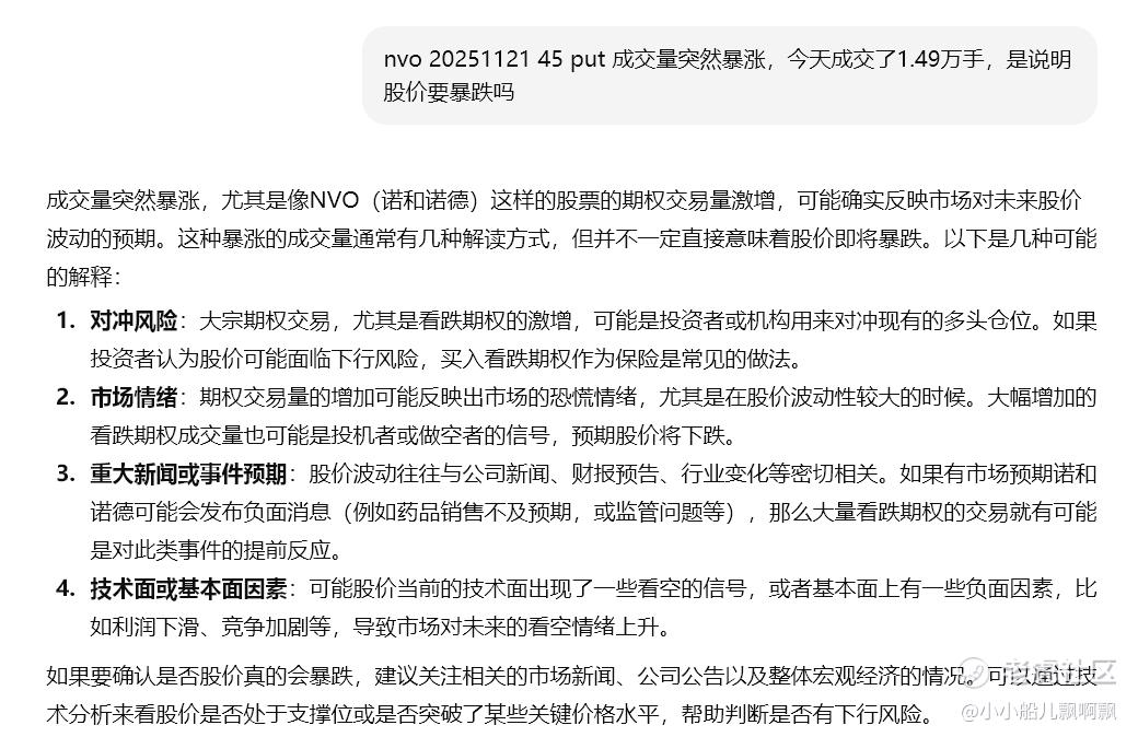 $诺和诺德(NVO)$ nvo 20251121 45 put,今天成交1.49万手,可能显示机构在用来对冲多头仓位,股价存在继续下跌风险。
