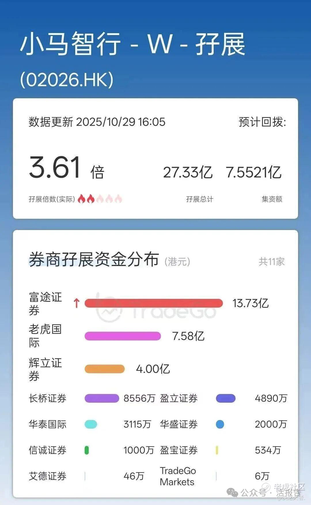 据捷利交易宝的新股孖展数据,截至10月29日16时,小马智行-W首日的孖展总额约27.33亿港元,孖展认购倍数约3.61倍。其中,富途证券、老虎国际、辉立证券分别放出13.73亿、7.58亿、4.00亿港元。